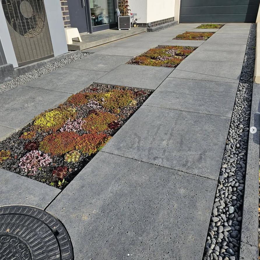 Ein schöner Kontrast zwischen Sedum / Sempervivum und Schelleviss Betonplatten. Zusätzlich wird nicht die ganze Fläche versiegelt 🐝🐞.